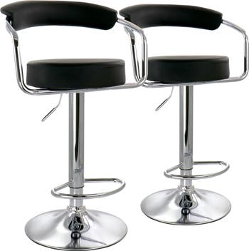 Add a stylish touch to your home bar or kitchen counters with the Elama 2 Piece Faux Leather Retro Adjustable Bar Stool in Black with Chrome Handles and Base. This set of chairs is uniquely retro shaped for a fun addition to any room. Swivel base is perfect for movability and adjustable height allows you to customize these stools to whatever height is most comfortable and convenient for your home counters. These adjustable chairs are crafted from quality metal and faux leather for a strong and long lasting design.