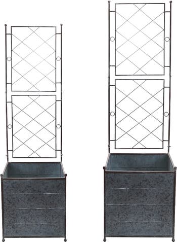- A stylish set of galvanized metal planters with trellis in a sleek silver finish