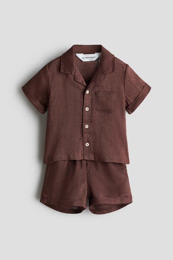 Set with a shirt and pair of shorts in soft, airy linen, ideal for warm summer days. Shirt with a resort collar, buttons down the front, a patch chest pocket, and short sleeves with sewn-in turn-ups at the cuffs. Shorts with an adjustable, elasticated waist and sewn-in turn-ups at the hems. Linen is a timeless textile with a light texture and fast-drying qualities that softens over time. The H&M Adorables collection is a curated selection of high-comfort, quality pieces with a timeless appeal.