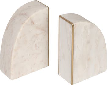Empower decor choices with this 2-piece set of marble bookends. Their white and gold finish with brass inlay adds a touch of elegance to any space, making them a perfect fit for modern, boho, minimalist, and glam interiors. Crafted from durable marble and brass, they offer both luxury and durability. Each bookend measures 3.5 inches in length, 1.5 inches in width, and 5 inches in height, making them the perfect size for holding up a variety of book sizes. The sleek design and timeless color scheme make these bookends a versatile addition to any home or office decor.