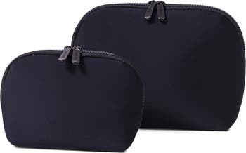 Two-way zip closures open thesecute neoprene makeup bags all the way so you can find things inside more easily. Both feature interior zip pockets and mesh dividers and can be tossed into the washer when you want to freshen them up.