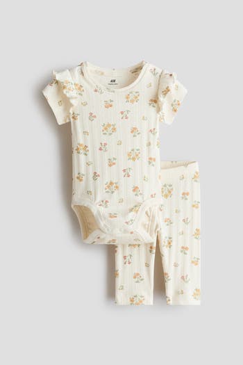 Set with a bodysuit and pair of leggings in soft, printed cotton pointelle jersey. Short-sleeved bodysuit with a frill-trimmed shoulder seam, round neckline, and press-studs on both shoulders and at the bottom for easy changing. Leggings with soft elastication around the waist.