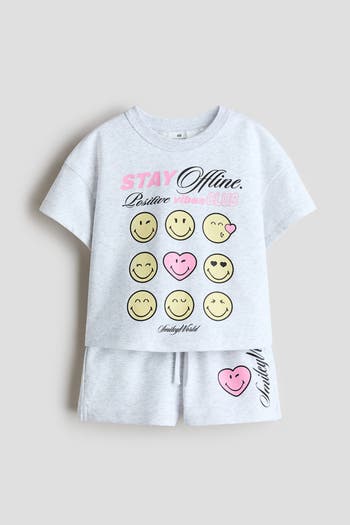 Set with a T-shirt and pair of shorts in printed sweatshirt fabric. T-shirt with a rib-trimmed neckline and dropped shoulders. Shorts with an elasticated, drawstring waist.
