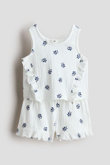 Set in crinkled jersey with a tank top and shorts. Tank top with a round neckline and ruffle trim at front. Shorts with an elasticized waistband and ruffle-trimmed hems.