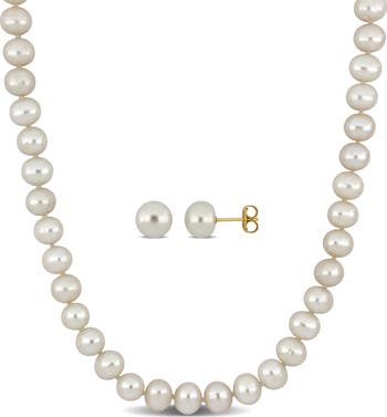 Add a touch of elegance with this cultured freshwater pearl necklace and stud earrings set, featuring 7.5-8mm pearls and crafted in 10K yellow gold. The classic design makes it a perfect accessory for any occasion, offering timeless beauty and sophistication. A lovely addition to your jewelry collection.