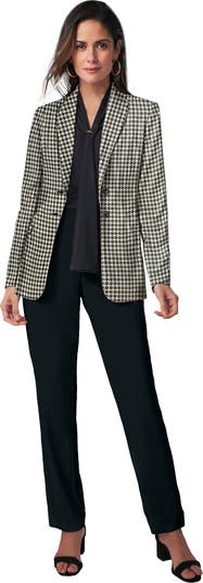 A polished power suit designed with curve-conscious tailoring and all-day comfort built in. This women’s plus size two-piece pantsuit delivers timeless, professional polish with modern stretch. A shawl-collar jacket layers effortlessly over flat-front pants designed with an extra-comfortable side-back elastic waist. Fully lined for a smooth, refined fit, this suit moves seamlessly from workdays to special occasions. Key Features:
