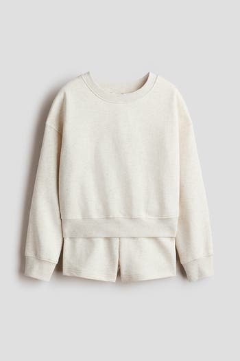 Set with a sweatshirt and sweatshorts. Long-sleeved sweatshirt with dropped shoulders, ribbing at neckline, cuffs, and hem, and soft, brushed inside. Shorts with an elasticized, drawstring waistband and a slit at hems.