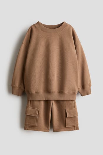 Set with a top and matching pair of shorts in sweatshirt fabric with a soft brushed inside. Top with a round, rib-trimmed neckline, dropped shoulders and long sleeves. Ribbing at the cuffs and hem. Cargo shorts with an elasticated, drawstring waist, diagonal side pockets and flap leg pockets.