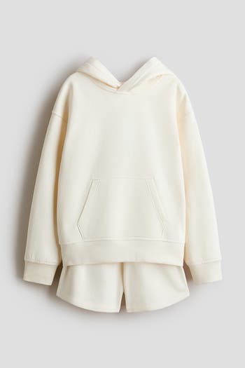 Set with a hoodie and matching pair of shorts in sweatshirt fabric with a soft brushed inside. Hoodie with a jersey-lined, wrapover hood, low dropped shoulders and long sleeves. Kangaroo pocket and ribbing at the cuffs and hem. Shorts with an elasticated, drawstring waist.