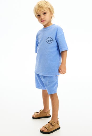 Set in soft terry with a T-shirt and shorts. T-shirt with ribbed jersey trim at neck, an embroidered motif at front, and dropped shoulders. Shorts with an elasticized, drawstring waistband and discreet side pockets.