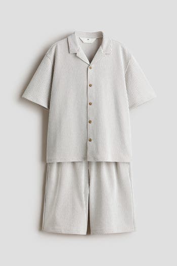 Set with a shirt and pair of shorts in textured jersey. Shirt featuring a resort collar, buttons down the front, dropped shoulders and short sleeves. Knee-length shorts with an elasticated, drawstring waist, diagonal side pockets and a patch back pocket.