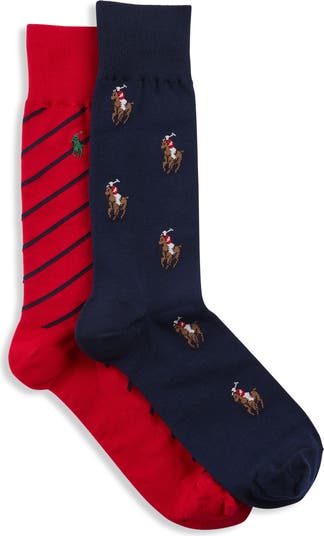 Iconic Polo style is yours right down to your toes with this 2-pack of socks from Ralph Lauren. They're designed in a soft, cotton blend and are detailed with stripes on one pair and signature embroidered Pony logos on the other. They're an easy-to-wear, polished style with dresswear and jeans alike._x000D_