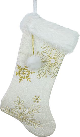 A lovely addition to your home this Christmas season is this sparkling stocking! The white fabric is enhanced with silver thread to make this a dazzling accessory perfect for the holidays. Hang this gorgeous Christmas stocking from your mantles, stairwells, and windows. Product Features: Cream, white, silver, and gold Christmas stocking Cream and white stocking accented with silver threads Various sized gold stitched snowflakes White faux fur cuff with a pom-pom Pom-pom dangles from a gold cord Features gold embroidered snowflakes Stocking has a one-sided design Comes ready-to-hang on a matching white loop Recommended for indoor decorative use only Care instructions: spot clean with mild detergent; do not wash Dimensions: 20" high x 10" wide Material(s): polyester/faux fur