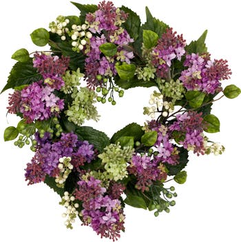 A circle of springtime delight - that's what we have here! Literally an explosion of colors and textures, this Lilac wreath combines beautiful Hanel Lilac blooms in various colors/stages of maturity, berries, and verdant leaves, all woven together in ring of beauty that never ends! At 20”, it's also the perfect size for almost any room that needs a little sunshine.
