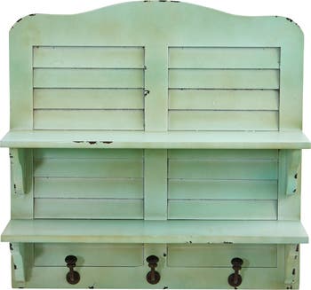 Created from the finest materials, this vintage shelf has two shelf spaces set against the backdrop of faux window shutters and three storage hooks. In light green, the bold, yet faded, color will give any room a retro look.