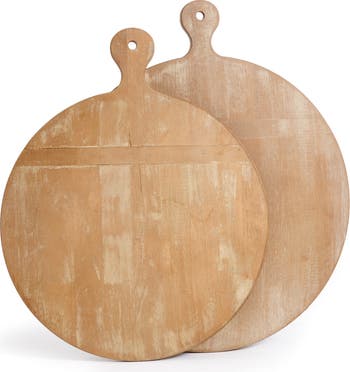 Enhance your kitchen or dining room with this set of 2 large, antique round wood cutting boards. Measuring 20" in diameter, these boards are made from premium wood, ensuring both durability and elegance. Whether you're preparing a meal or serving guests, these boards are perfect for everything from chopping vegetables to serving a beautifully arranged charcuterie board. Their timeless design makes them a great addition to any farmhouse or rustic-themed kitchen. The set of two offers versatility, giving you a larger surface for meal prep or serving a variety of dishes. The antique finish adds a touch of rustic charm to any table setting, making these boards as decorative as they are practical. Whether you’re hosting a dinner party or simply enjoying a casual meal, these boards bring both style and functionality to your kitchen. They also make a great gift for those who enjoy hosting, cooking, or adding character to their home decor. With proper care, these cutting boards will maintain their beauty for years.