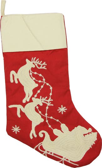 Traditional red and white stockings with a design of Santa in his sleigh with two reindeer One-sided design Each comes ready-to-hang on an off white lip Dimensions: 20"H x 11.5"W Materials: fabric