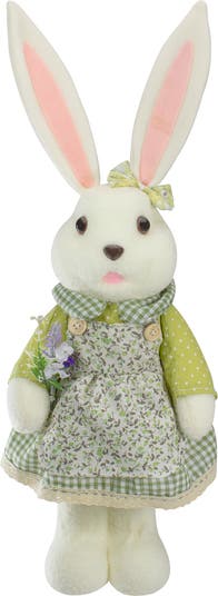 Bring home that Easter feeling today with this lady bunny rabbit figure. This bunny comes dressed in a green and white polka dot and plaid dress with a matching floral apron. She carries a bouquet of flowers in her hand. Her ears can be shaped in any direction you wish. She will be a perfect addition to your holiday or spring decor for years to come. Features: Green and white bunny rabbit figure Dressed in a green and white plaid and polka dot dress Bunny's dress is accented with matching floral apron Wire in ears allow you to shape as desired Recommended for indoor use only Dimensions: 20"H x 7"W x 5"D Material(s): fabric/foam/wire/plastic