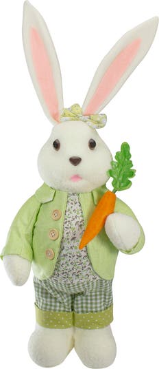 Bring home that Easter feeling today with this lady bunny rabbit figure. This bunny comes dressed in a green and white polka dot and plaid pants with a matching floral shirt with green jacket. She carries a carrot in her hand. Her ears can be shaped in any direction you wish. She will be a perfect addition to your holiday or spring decor for years to come. Features: Green and white bunny rabbit figure Dressed in a green and white plaid and polka pants Bunny wears a green and white floral shirt with a green jacket Wire in ears allow you to shape as desired Recommended for indoor use only Dimensions: 20"H x 8"W x 4.5"D Material(s): fabric/foam/wire/plastic