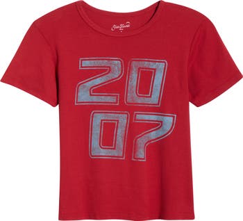A weathered athletic graphic marks the year on this comfy cotton-jersey T-shirt.