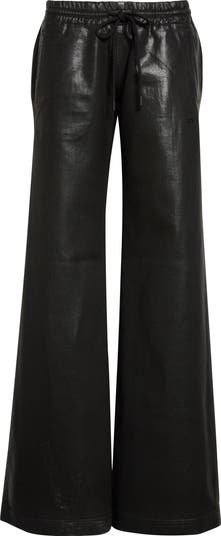 Built with that signature grungy point of view but wearing with the ease of your go-to sweats, these wide-leg pants hit with a proper late-night gloss. The fabric is treated with multiple coating layers to dial up a smooth, supple feel then finished with a black spray application that deepens the tone like fresh asphalt. A final pressing technique locks in a distinctive sheen to give the silhouette a slick, after-dark edge.