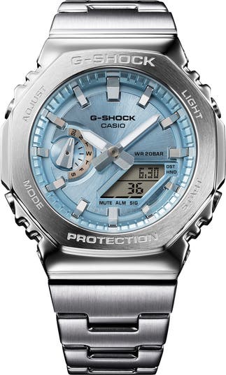 The analog-digital functionality and statement-making design of this 2110 Series watch creates a versatile look that's both sporty and refined. Shock resistance, LED light, countdown timer, world time, multiple alarms, stopwatch and auto calendar features complete this sleek timepiece.