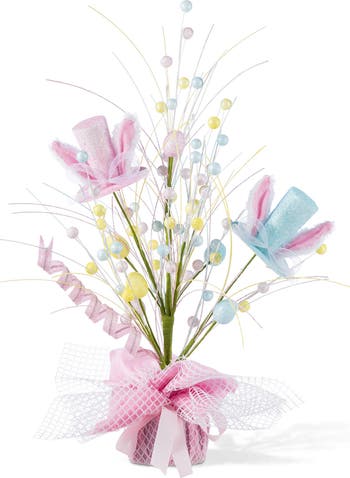 This 21"H Easter Table Tree features pastel colored glitter eggs, charming top hats with bunny ears, and delicate decorative sprigs. It's nestled in a pink wrapped base with a bow, perfect for adding a festive touch to Easter tabletops.