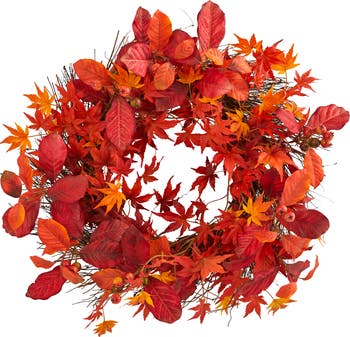 The Japanese maple artificial wreath sports numerous red, orange, and yellow leaves with small berries sprinkled with in the arrangement. Colorful and vibrant, this artificial wreath will make quite the statement when hung in front of a vanity's mirror in your bedroom. You can also use it to decorate your kitchen space by placing it on any interior wall or in front of a window.
