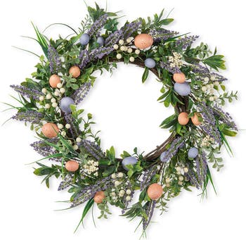 This wonderful Easter egg and Lavender wreath is a must have for the holiday. The wreath showcases a harmonious blend of green leaves, delicate lavender blooms, charming pink & purple egg-shaped and white berries.The intricate arrangement exudes a sense of nature's bounty, blending seamlessly into your holiday decor.