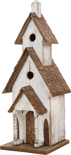 Enhance your space with this distinctive oversized villa-style decorative birdhouse. It is crafted of durable solid wood with handcrafted textured roof, washed white finish and distressed details that brings a touch of rustic charm and aesthetics. This great design can not only transform your space into a haven for small feathered friends but also create a warm and inviting ambiance to highlight your garden, patio, backyard, or any other outdoor space!