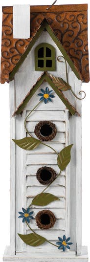 Transform your garden with this stunning villa-style birdhouse featuring a washed-white finish and blue floral accents. The 3 tier design offers multiple nesting spaces while creating a beautiful focal point. Built from solid wood with a metal roof, it withstands all weather conditions. Perfect for spacious gardens, it serves as both a bird sanctuary and an impressive decorative piece.