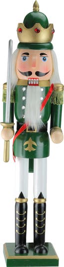 Add a new twist to your holiday decor with this large King nutcracker. The perfect way to celebrate your Christmas holiday by displaying this Nutcracker by entryway doors, on tabletops, mantles, and desks. Give as a gift to a loved one or as a gift for yourself. Product Features: Traditional Nutcracker King with a sword Wearing a green coat accented with gold tassels and clear gems Also wearing white pants, black boots and belt with gold accents Holding a gold and silver sword while wearing a green and gold crown accented with red gems Stands on an attached and sturdy green and gold base Mouth opens and closes with lever Recommended for indoor decorative use only Dimensions: 24"H x 5.5"W x 4.75"D Material(s): wood/plastic/faux fur