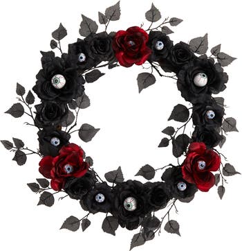 Keep a wondering eye throughout Halloween with this spooky eyeballs wreath. Blue and green eyeballs are nestled in between red and black flowers for an edgy look that'll satisfy even the pickiest Halloween enthusiasts. Be different and bold. With a dimension of 24in. house in any area that needs an extra pair of eyes. Add to a bare wall or door. Artificial wreaths are manufactured using synthetic materials, such as polyester material or plastic, and are well designed and constructed to be life-like in appearance. This item will need to be re-shaped when removed from the secure box to allow it to reach its fullest size. Your wreath will look beautiful for years to come; simply wipe clean with a soft dry cloth when needed.