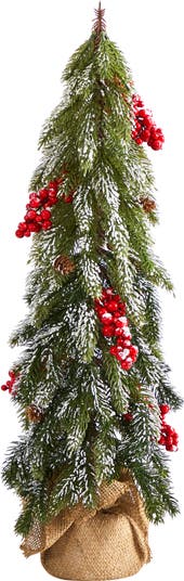 Create the ultimate winter wonderland scene in your home or office with the help of this flocked artificial Christmas tree! Completely maintenance-free, this winter-inspired fake Christmas tree boasts an array of soft looking foliage, enhanced throughout with faux pinecones and bright red holly berries and finished with a light dusting of faux snow to evoke a winter setting. Standing 24” tall from an accompanying burlap base, this festively flocked artificial Christmas tree will not only make holiday decorating a breeze but ensure your home is always looking picture-perfect throughout the holiday season.