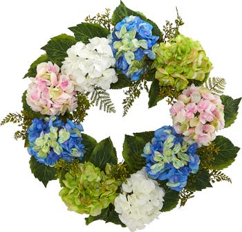 Stunning green leaves surround the bright pink, green, white and blue blooms of this hydrangea artificial wreath. With colors reminiscent of spring, it'll bring warmth and delight into your bedroom as a decoration for your wall. Though, it doesn't have to be limited to the bedroom, place it in front of a mirror in your living room to lighten things up or great guests as they enter through the front door.