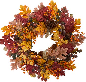 You can feel the crisp autumn air with this beautiful wreath made up of faux oak leaves and acorns. A perfect ornament to hang on your entry door, it also is great indoors as a wall hanging or even a table centerpiece when votive candles and other items are placed around and inside it.