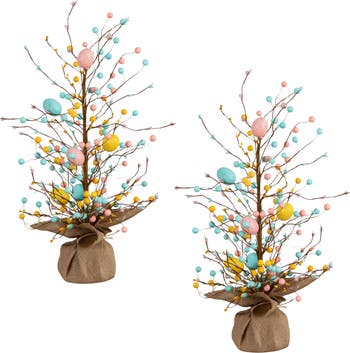 - 24-In pre-lit artificial Easter twig tree with pastel colored eggs throughout, comes as a set of 2