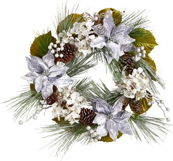 24-in Silver Poinsettia, Hydrangea and Pinecones Artificial Christmas Wreath