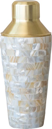 - A stunning cocktail shaker featuring a gold finish and natural white mother of pearl inlay