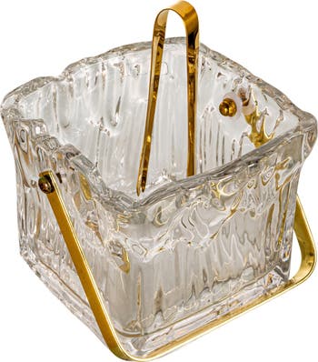24-Ounce Textured Glass Ice Bucket with Gold Finish Handle and Tongs, Clear/Gold