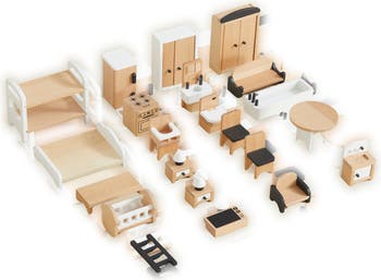 Accessorize your child's dollhouse with this set of 24 wooden pieces that include everything they need from doll-sized beds to nightstands, tables, chairs, an oven, sink, a bathtub and more. The wooden furniture is sized perfect to fit in Wonder & Wise's Wooden dollhouses (sold separately).