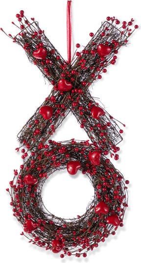 This 24"H Red Valentine's Wreath is a charming and eye-catching decoration. It is crafted from intertwined branches, forming an XO shape, and adorned with numerous red berries and heart shaped accents. This wreath is perfect for adding a romantic and festive touch to your door or wall during Valentine's Day.