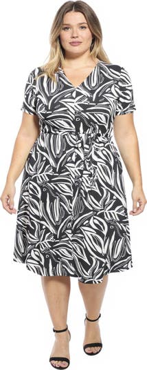 Add a refined touch to your wardrobe with this plus size black abstract print V neck short sleeve tie waist A line midi dress from 24seven Comfort Apparel. The adjustable waist enhances the timeless silhouette, while the vibrant geometric pattern adds modern appeal. Pair with heels or flats for work or weekend plans, machine washable and tumble dry for easy care.