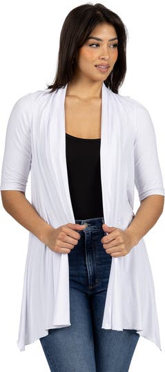 This cardigan features a cascading open front with loose fit designed to flatter any figure. The half sleeves make this piece perfect to wear in all seasons and easy to dress up or down for a comfortable but business casual look. Made from a comfortable stretch material. Rayon Spandex Knit.