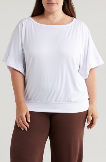Wide sleeves and a banded hem add to the easy relaxed fit of this T-shirt cut from a fine drapey knit that gives your casual look a bit of pulled-together polish.