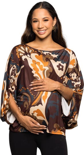 Add a pop of artistic flair to your wardrobe with this brown print dolman sleeve maternity top. Featuring a relaxed silhouette and bold swirl design, this blouse offers effortless comfort with a touch of elegance. The wide sleeves with slit detailing give it a breezy, modern finish, making it perfect for both casual outings and chic evenings.