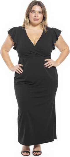 Plus Size Solid V-Neck Tulip Hem Ruffle Sleeve Faux Wrap Maxi Dress
