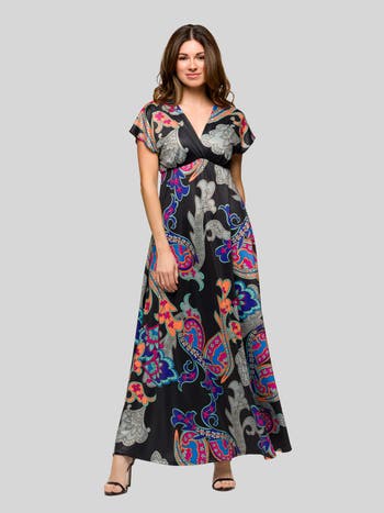 Turn heads in this striking Black Paisley Print V Neck Empire Waist Maxi Dress, where timeless style meets modern sophistication. The V shaped neckline and back design add a touch of allure, while the kimono style cap sleeves offer a breezy, comfortable fit. The empire waist creates a flattering silhouette, perfect for all body types. Crafted in a lightweight polyester blend, this flowy maxi length dress is ideal for summer soirées, wedding guest outfits, or casual outings. Its versatile paisley print seamlessly transitions from daytime chic to evening elegance, making it a must have addition to your wardrobe.