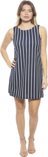 Stay cool and stylish with this navy striped sleeveless mini shift dress from 24seven Comfort Apparel. Featuring a classic round neckline and relaxed fit, this effortless style flatters every figure. Crafted from smooth, slightly textured stretch fabric with a structured drape that holds its shape, it is perfect for casual outings. Machine washable and tumble dry for easy care.