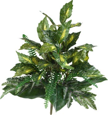 The variegated leaves of this 25-inch mixed greens artificial plant sit atop larger green leaves with wild ferns peeking out from the foliage in a splendid, arrangement. Suitable for any professional setting, it will look great in a clear vase on a desk in a office, or on the counter in a reception area. For symmetry in your arrangement, it comes in a set of two.